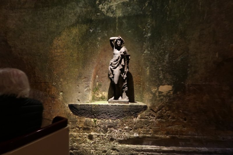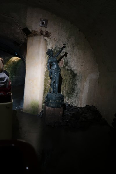 Avant de nous plonger dans les entrailles des caves, nous nous faisons tous immortaliser devant l'immense foudre d'une contenance équivalente à 200,000 bouteilles de champagne qui fut convoyé par un immense attelage de chevaux à Paris pour l'Exposition Universelle de 1889. Rendus quelques mètres plus bas, le petit train électrique de la maison Mercier nous fait parcourir une partie des 18 kilomètres de caves délicatement éclairées nous faisant découvrir de charmantes statuettes et autres bas-reliefs qui entrecoupent des sortes d'alcôves où maturent des bouteilles de ce charmant liquide pétillant nommé Champagne.