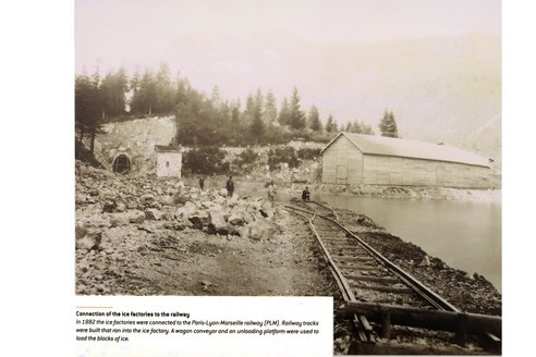 L'expédition finit par se faire par rail directement de la glacière. L'isolation thermique des parois et des toits des wagons était confiée à des "coussins" de paille qui permettaient de limiter la perte de glace à seuls 15 ou 20% à son arrivée à... Alger! Dans la photo d'époque ci-dessus à gauche l'on aperçoit le tunnel qui est aujourd'hui utilisé par le TGV Genève-Paris!