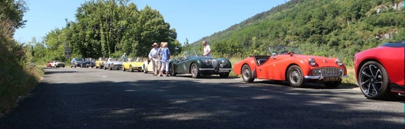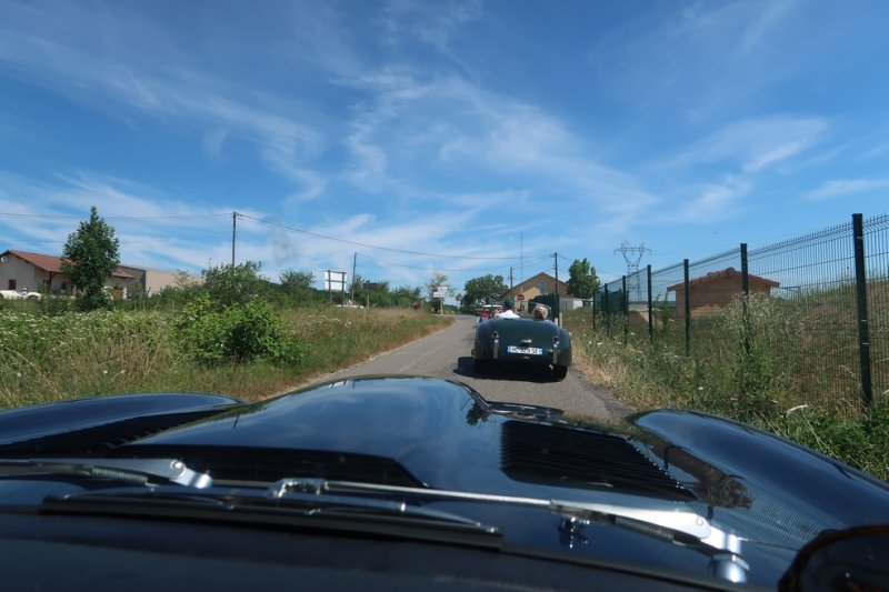 Enfin, pas tout à fait, car à l’ANLVA, le trajet entre un point A et un point B n’est jamais le plus court. Il passerait même systématiquement par tous les coins d’un cube. La E Type va d’abord devoir retrouver ses copines Anglaises au pied d’un château, celui de la Cueille. Niché au sommet d’un piton surplombant l’Ain du haut de ses 70 mètres, et bien que datant du XIIIe siècle, ce château eut un hôte de renommée plus récent en la personne de l’amiral Philippe de Gaulle, non seulement fils du “Grand Charles” mais aussi et surtout époux de la chatelaine d’alors, Huguette de Montalembert.