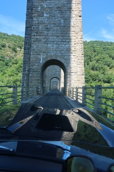 Le viaduc construit en 1875 doit sa renommée à plusieurs facteurs. D’abord son architecture monumentale composée de deux rangées d’arches superposées pour permettre le passage d’automobiles au premier étage, et celui de trains tout en haut à 57 mètres au-dessus de l’eau. Mais vint la deuxième Guerre Mondiale et avec elle les fameux maquisards de l’Ain. Comme la bande de cambrioleurs de Michael Caine dans le célèbre film “L’or se barre” dans lequel ils ne devaient faire sauter que les portes arrières du fourgon plein de lingots, les maquisards ne voulant faire “péter” qu’une portion entre deux piliers pour couper le traffic ferroviaire nazi en 1944 eurent la main un peu lourde sur le trinitrotoluène et oups! c’est tout le viaduc qui descendit prendre un bain dans l’Ain! Il fut cependant reconstruit à l’identique et permet aujourd’hui le passage du TGV qui, venant de Genève, passe (tiens tiens!) dans l’arrière cour des Glacières de Sylans que nous avons visitées en Avril, avant de “monter à Paris”, comme on dit.