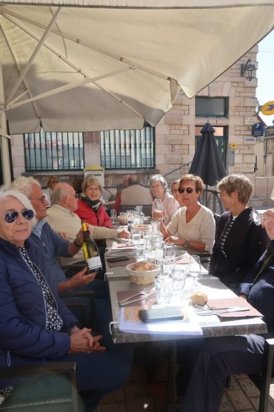 Arriver en plein jour à Nuits pourrait être un tour de force digne de Raymond Devos, mais c’est bien à Nuits-Saint-Georges que nous sommes attendus pour le déjeuner. Mais s’il n’y avait que cela! Effectivement l’autre tour de force fut d’avoir tous religieusement pris une rue en sens interdit pour rejoindre le parking où les deux seuls gendarmes de France à ne pas avoir été affectés à la surveillance des manifestations de grève ont décidé de sortir leurs griffes car, en plus de cela, certaines de nos anglaises étaient garées hors cases. Mais encore fallait-il en deviner les lignes qui devaient dater du moyen-âge! Mais bref, réalisant soudain le nombre d’autos à verbaliser et que c’était l’heure du déjeuner les carnets à souches furent remballés, mais à regret, par les courroucés képis. Ah oui, le déjeuner, le nôtre, est juste à côté au Café du commerce, en face de la poste sur la place de la République et sous la surveillance de l’élégant Beffroi de la ville du haut de ses 400 ans.
