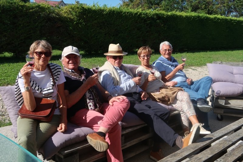 Coffres bien remplis de bouteilles de crème de cassis, confitures et autres miels, les vieilles anglaises reprennent la route, traversant avec vénération des vignes aux noms mythiques connus du monde entier pour finalement atteindre notre hôtel au nom bien surprenant de Camp Romain. Le temps des ablutions pris, arrive celui des inévitables libations sur la terrasse, à base de crème de cassis bien sûr.