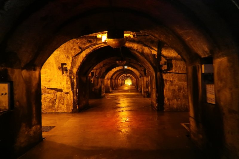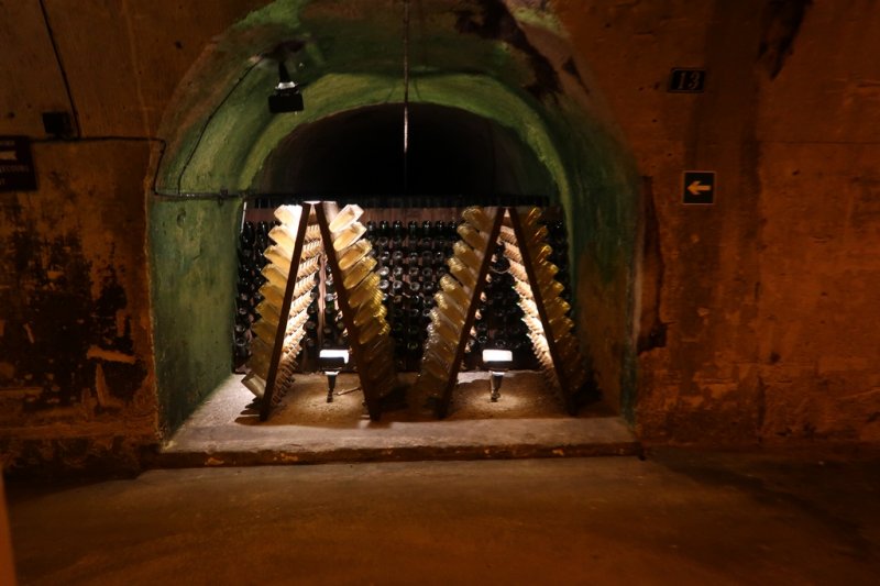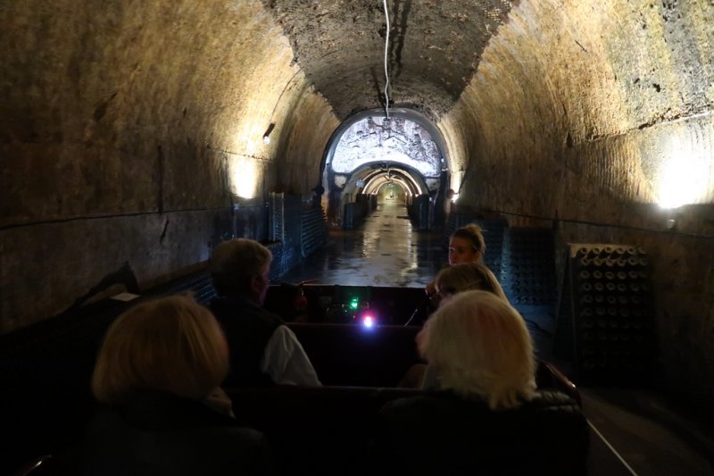 Avant de nous plonger dans les entrailles des caves, nous nous faisons tous immortaliser devant l'immense foudre d'une contenance équivalente à 200,000 bouteilles de champagne qui fut convoyé par un immense attelage de chevaux à Paris pour l'Exposition Universelle de 1889. Rendus quelques mètres plus bas, le petit train électrique de la maison Mercier nous fait parcourir une partie des 18 kilomètres de caves délicatement éclairées nous faisant découvrir de charmantes statuettes et autres bas-reliefs qui entrecoupent des sortes d'alcôves où maturent des bouteilles de ce charmant liquide pétillant nommé Champagne.