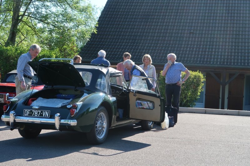 Les bagages retrouvent leur place dans les coffres en ce dernier matin ensemble en vue de partir pour notre dernière visite, à Clairvaux, mais si tous les moteurs démarrent, la boîte de vitesses de la Triumph TR3 de François et Marie refuse obstinément d'offrir tout autre rapport que la marche arrière. Il en seront quittes pour transférer leurs bagages dans l'ample coffre de la Jaguar XJ6 d'Eric et Paola ("les amis suisses" dixit Catherine).