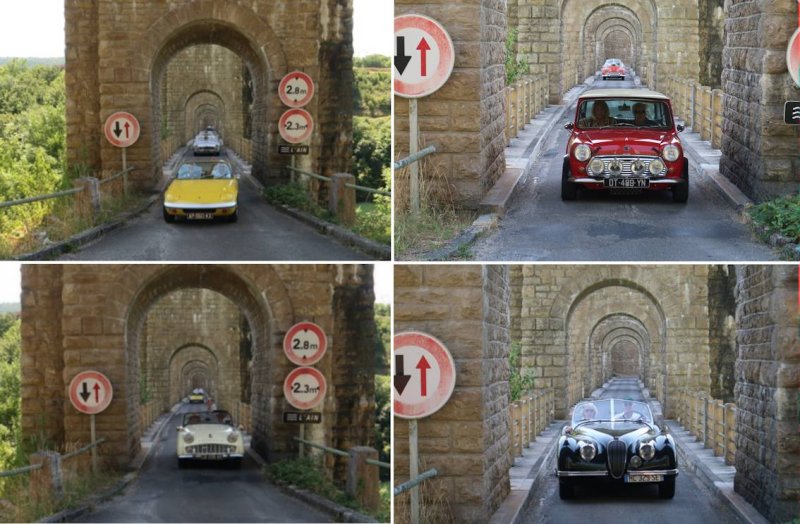 Bref, nos autos font un bref arrêt au pied de l’ouvrage pour l’admirer avant de le traverser comme l’on remonte la nef d’une cathédrale, arche après arche. A la sortie, elles virent à droite pour prendre la route la plus courte vers la modeste demeure d’Isabelle vers Ceyzerat, c’est à dire en faisant un crochet par un sympathique camping verdoyant au bord de l’eau, puis un arrêt dans une fruitière pour certaines et un détour champêtre forcé pour toutes pour cause de travaux avant de passer le portail des Soudanières où elles sont priées, Anglaises oblige, de rouler sur le gazon (si, si!) pour se ranger dans la douceur de l’ombre offerte par une rangée de cerisiers.