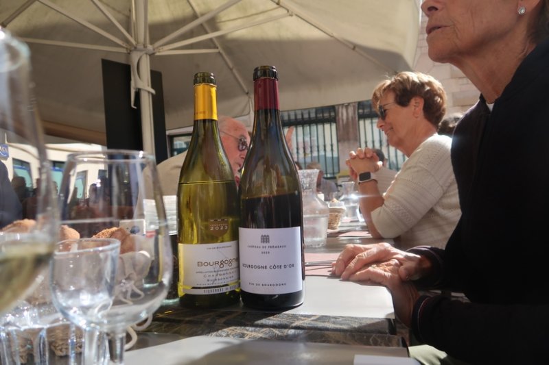 Arriver en plein jour à Nuits pourrait être un tour de force digne de Raymond Devos, mais c’est bien à Nuits-Saint-Georges que nous sommes attendus pour le déjeuner. Mais s’il n’y avait que cela! Effectivement l’autre tour de force fut d’avoir tous religieusement pris une rue en sens interdit pour rejoindre le parking où les deux seuls gendarmes de France à ne pas avoir été affectés à la surveillance des manifestations de grève ont décidé de sortir leurs griffes car, en plus de cela, certaines de nos anglaises étaient garées hors cases. Mais encore fallait-il en deviner les lignes qui devaient dater du moyen-âge! Mais bref, réalisant soudain le nombre d’autos à verbaliser et que c’était l’heure du déjeuner les carnets à souches furent remballés, mais à regret, par les courroucés képis. Ah oui, le déjeuner, le nôtre, est juste à côté au Café du commerce, en face de la poste sur la place de la République et sous la surveillance de l’élégant Beffroi de la ville du haut de ses 400 ans.